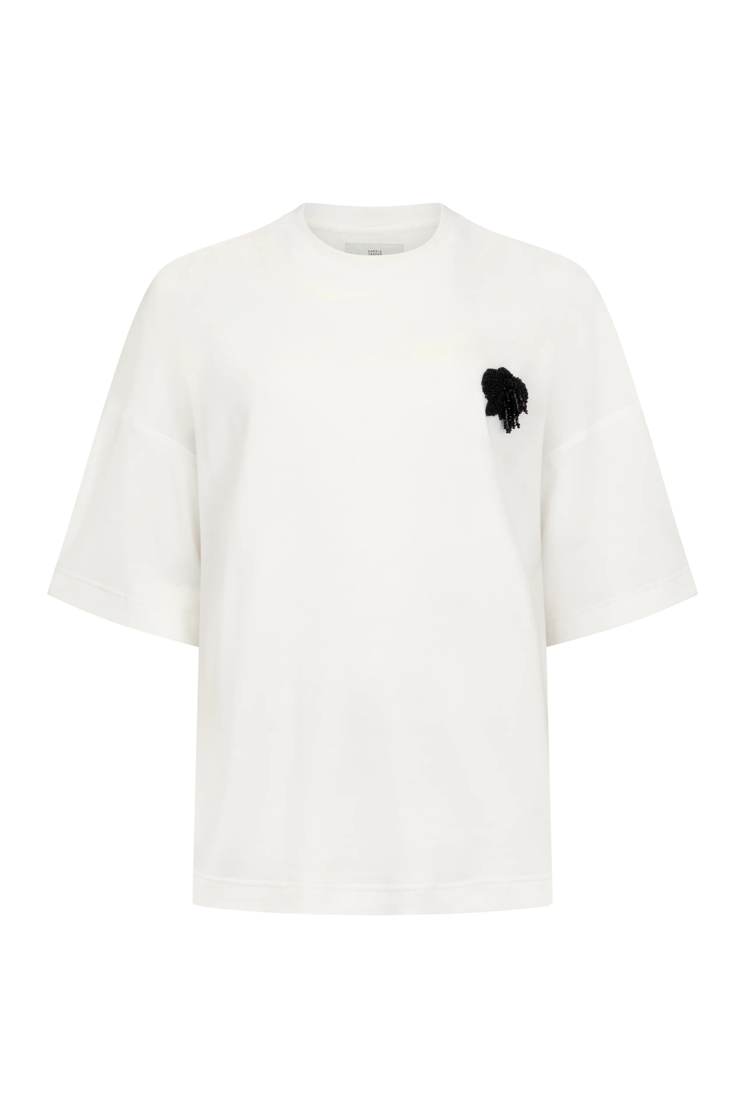 Cut from Cotton T-shirting with dropped shoulders and elbow grazing sleeves for an intentionally oversized fit. Signature black orchid beading embellishes high on the left chest.