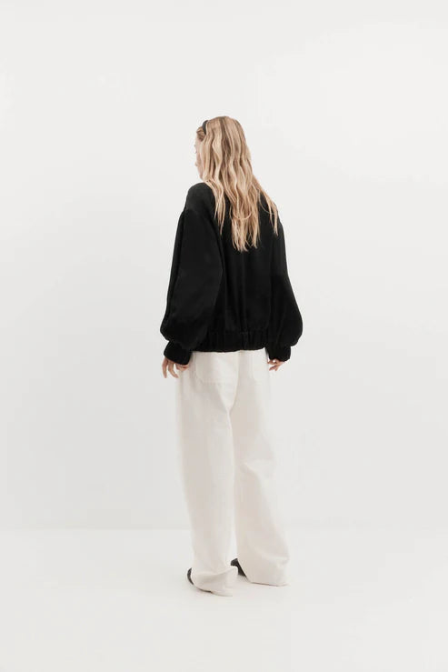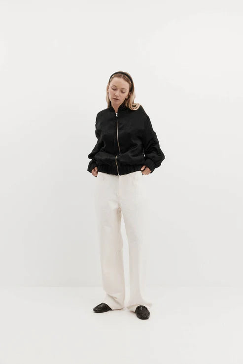 A lightweight bomber cut in black satin jacquard featuring a band collar, front pockets and tassel zip. Fully lined.