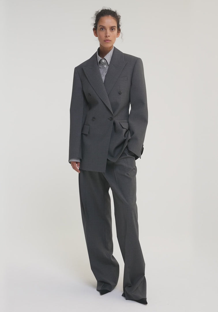 The hourglass blazer features a sharply cut notch lapel and a beautifully architectural silhouette that cinches in at the waist and defines the shoulder. A sculptural take on classic tailoring designed for a structured yet feminine shape.