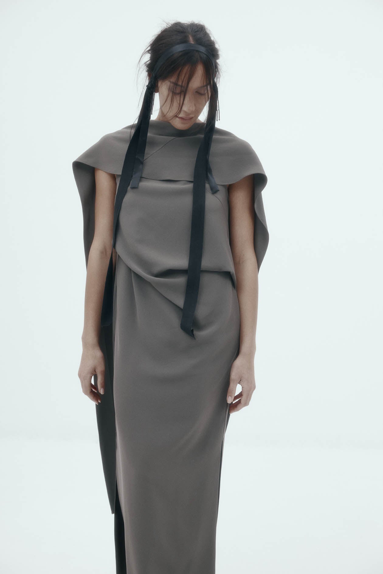A floor length silhouette with sculptural tuck detailing at the waist falls elegantly in drape suiting. Sash detailing drapes across the shoulders, designed to cascade elegantly down the back or be tied into a soft, half knot.
